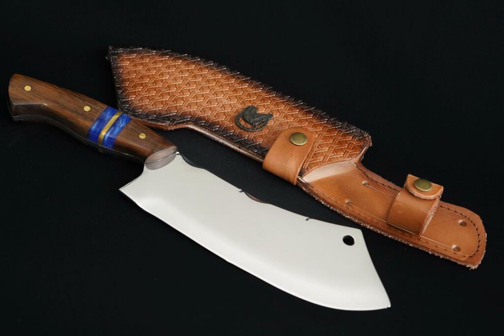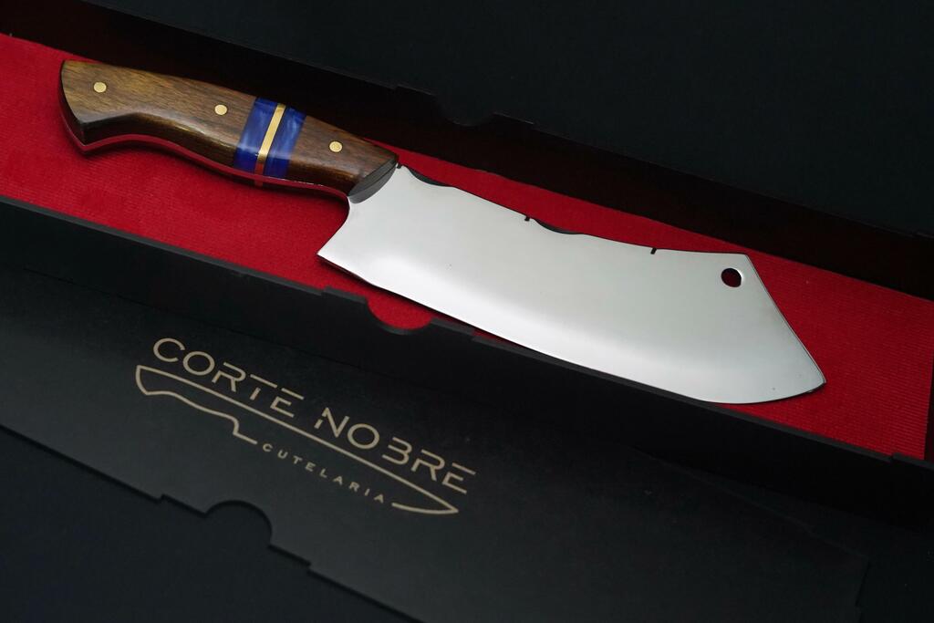 O cabo em madeira de imbuia, adornado com linhas de resina, proporciona um design elegante e firmeza na pegada, permitindo cortes seguros e rápidos. E para personalizar sua experiência, o cutelo acompanha seu nome personalizado e uma bainha para transporte